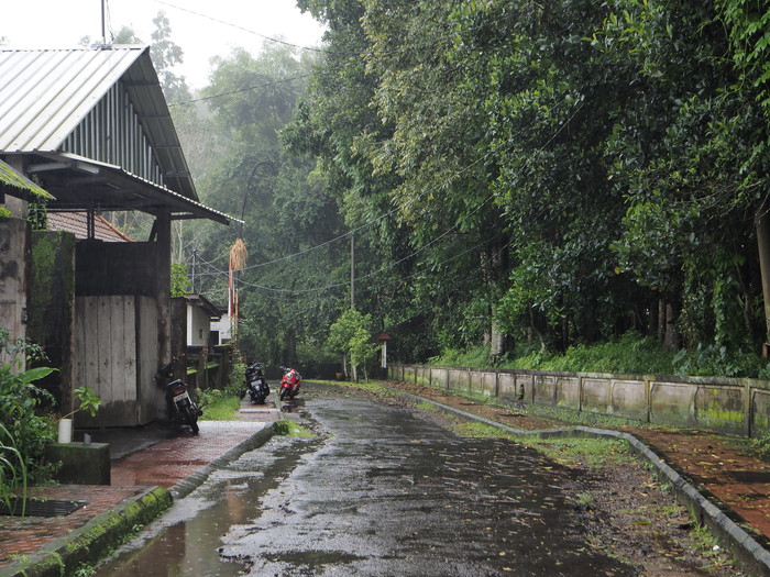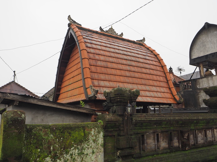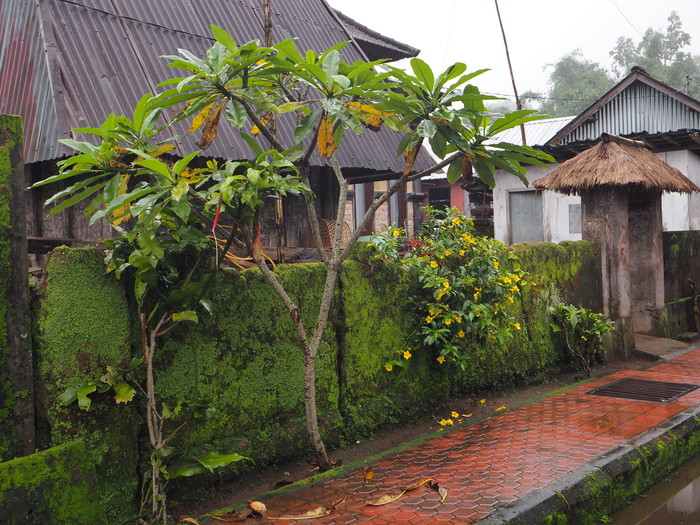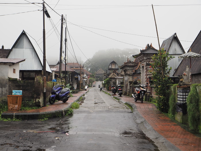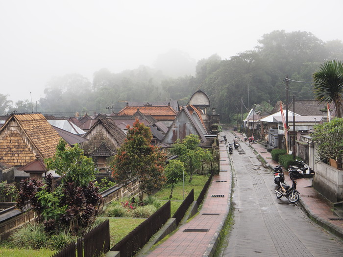 雨に霞むバユン・ゲデの村。他のバリの集落とは趣が異なる。トタンや瓦の屋根がほとんどだが、木の皮を葺いた屋根が散見される。