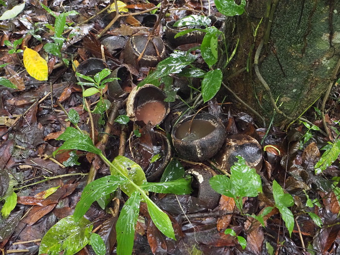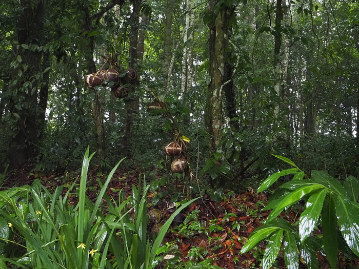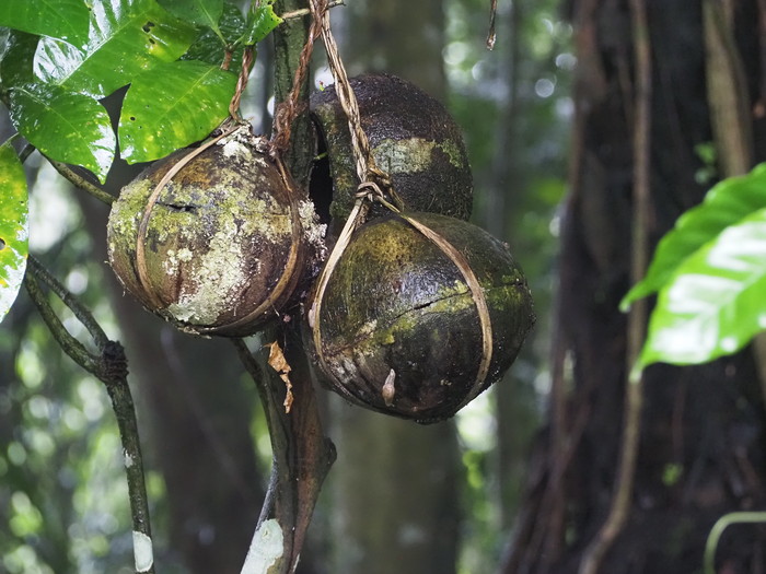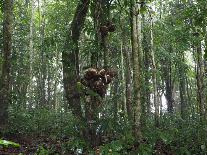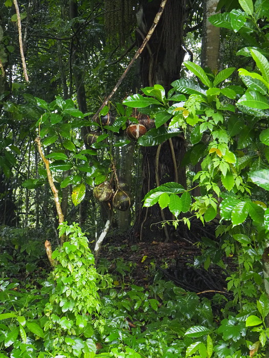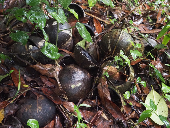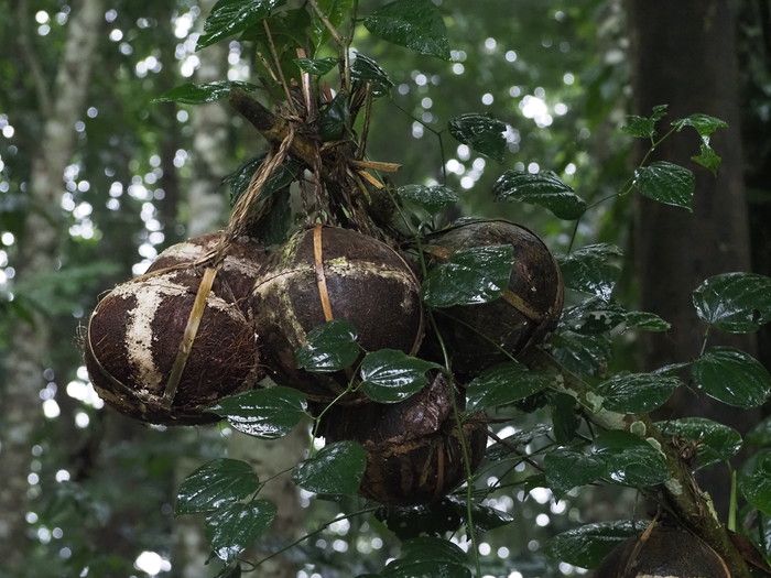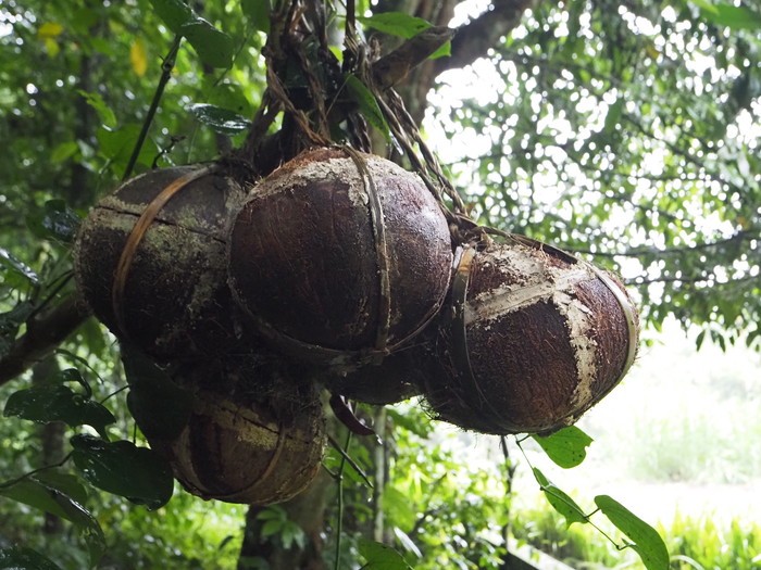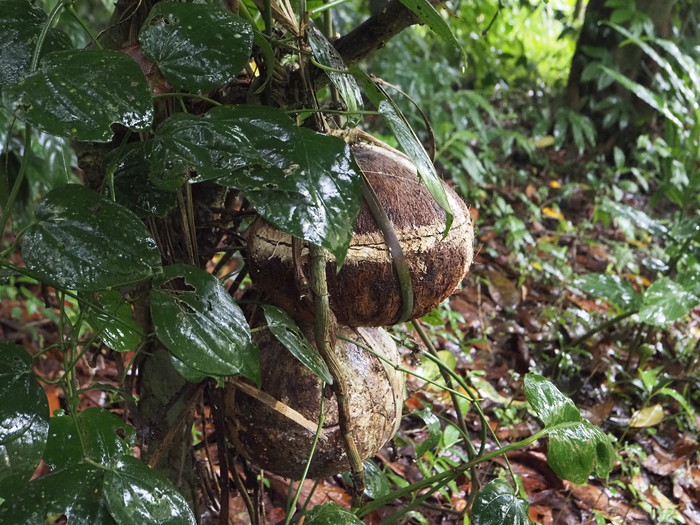 見れば、木の下にはヤシの実がたくさん落ちていた。ぱっかり割れているものもあった。基本的には落下したヤシの実は放っておくらしい。落ちずにいつまでも木に吊られていると子供は健康に育つのだが、落ちたら落ちたでそれなりに、という事のようだ。割れたヤシの実の中に胎盤があるのか? と思って見てみたが、そこにはもう濁った水が溜まっているだけだった。