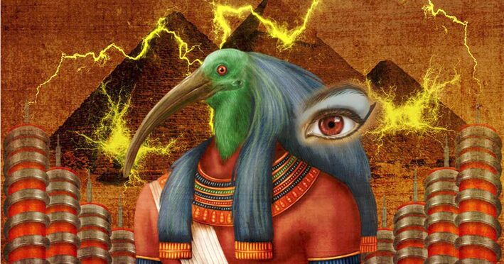 それは円柱状の8本の構造物で、カフラー王のピラミッドのおよそ4倍の高さにも達するそうです。以前の記事で「ピラミッドは惑星間通信機」「地下構造群は通信機の電源」という仮説があったので、そこから今回はテスラコイル的なものをイメージし、「オグドアド(八位一体)」の対称性を意識しました。真ん中のトート神はエジプトにおいて伝達も司るので、通信との繋がりからこのモチーフを選んでみました。