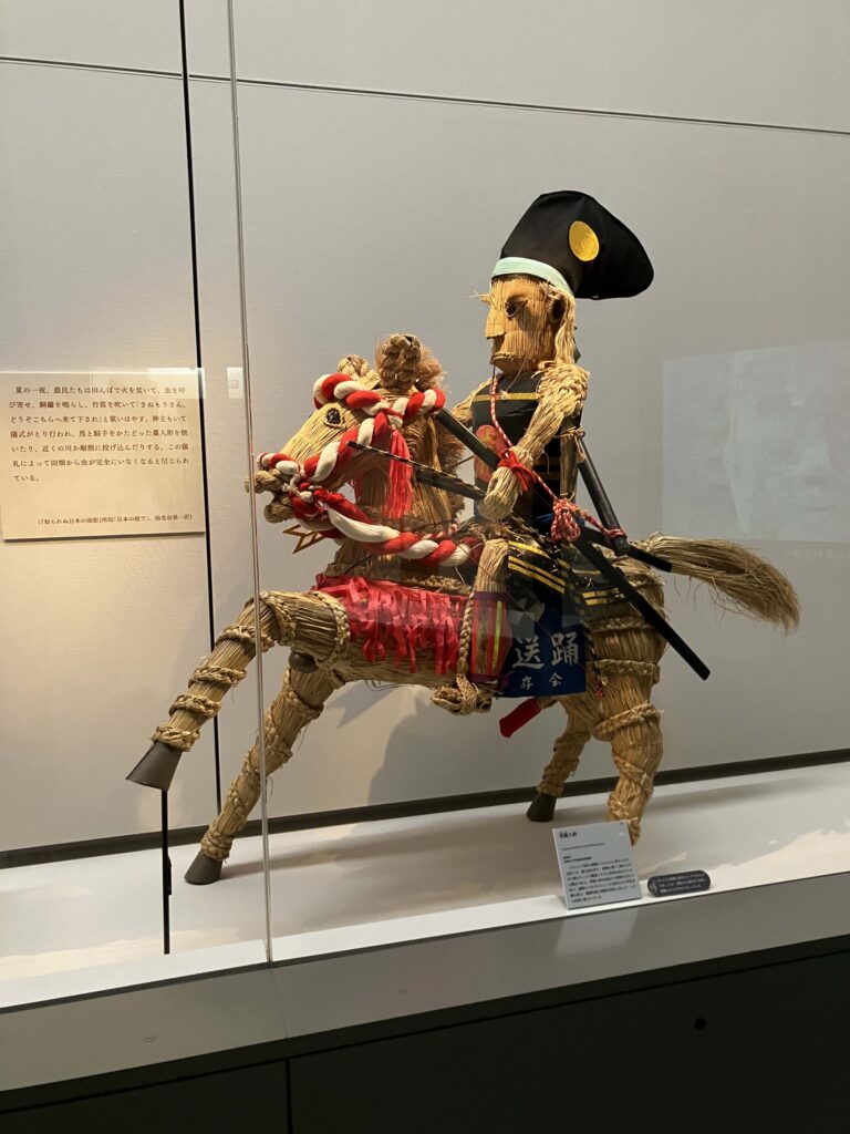 展示の注目資料のひとつが「実盛人形」だ。実盛送り(虫送り)という民俗儀礼に使われた大型の立体資料で、こうした実物が置かれているのがこの展示の面白さだ。日常で虫送りの人形を目にする人はほとんどいない現代、八雲が異形の存在として肌で感じたことを追体験できる。