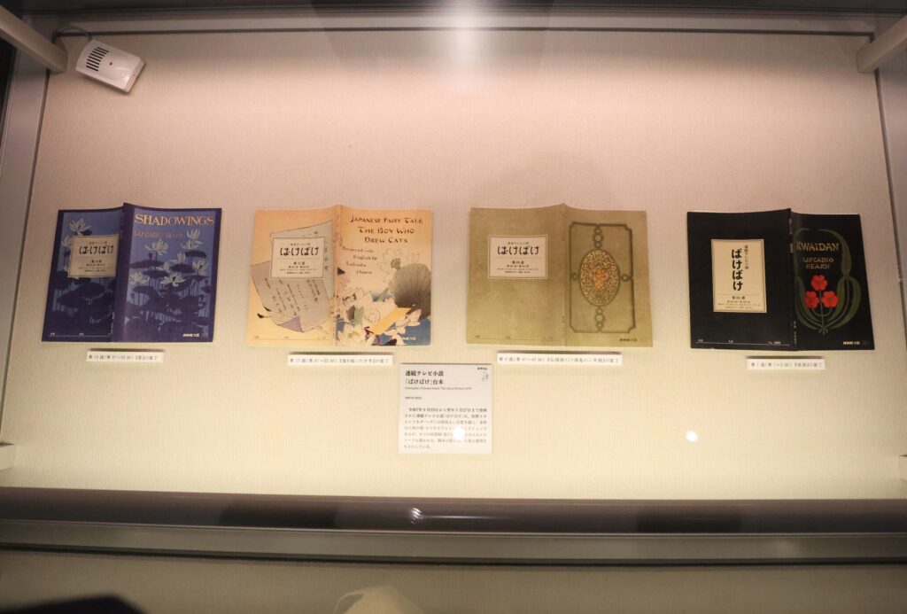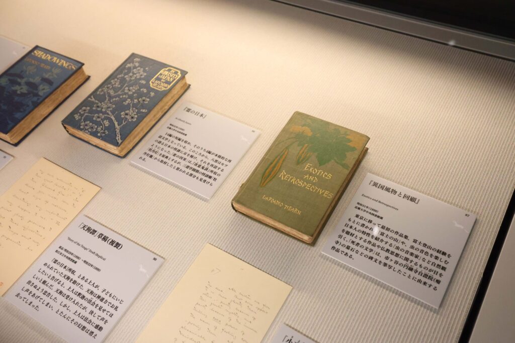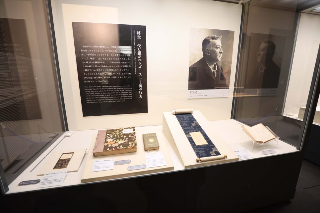 最終章は八雲の死後の話。資料は少ないが、一つひとつが重い。圧巻なのが「日本の子守唄」の装幀だ。八雲がローマ字で書き留めた子守唄の原稿に、周囲を布で表装したものが展示されているが、この布は八雲が亡くなったときに使っていた布団の生地なのだという。息子の一雄が、父が書いた子守唄を、父が最後に眠った布団の布で包んだ。子供のために書かれた歌と、父の最期の眠りが、一つの表装の中に重なっている展示品となっていて、見ている人の中には何か胸に来るものがあったのか、目頭を押さえている人もいた。