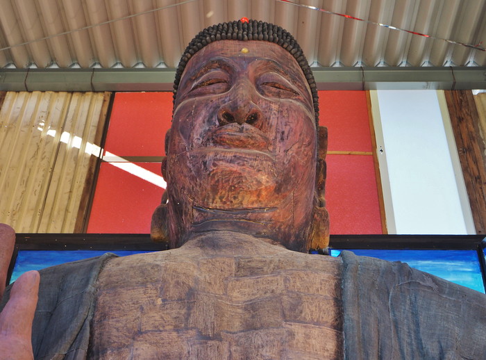 薬壺を持つ左手。表面に麻布を張って、その上から塗装してあるようだ。よく見ると顔以外の衣や胸元も同じように布が張られている。これは奈良時代に造仏に用いられた脱活乾漆法を西沢流にアレンジしたものだ。このように独学で様々な技法を編み出し、独自の大仏を生み出したのである。一方、工法もかなり独特だ。この大仏があった場所は元々養蚕小屋だったという。その小屋の中で台座から造り始めて徐々に上へ上へと積み上げていく。1階の天上をぶち抜き、更に上まで造っていく。すると2階の屋根を抜かないと頭が乗らないことが判明。そこで建物を解体し、建屋を造ったのだという。