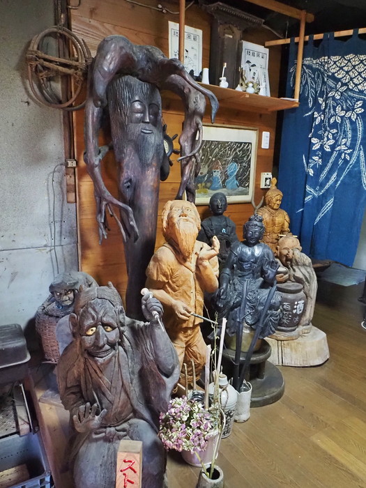 西沢さんに疑問に思っていたことを聞いてみる。例の「ずくだせ明王」の事である。作者の高橋さんについて伺うと、なんとと「仏像を彫るきっかけになった知り合い」というのが高橋さんのことだったのだ。ちなみに自宅内の作品群の内、一番奥にあった根っこが髪の毛になっている作品は高橋さんのものだった。