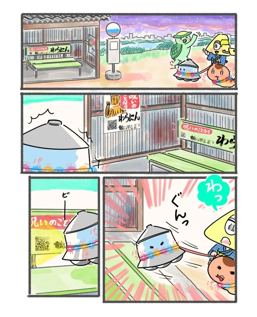 蛸山めがね 望月さんからは世界観がちょろっとわかるように、キャラの後ろに少し背景を入れてくださいね。という依頼がありました。あのトタン屋根のバス停は、どうしても“わらにん”の宣伝看板を昭和のホーロー看板にしたくて、それに似合いそうなトタン屋根のバス停を調べて描きました。街の世界観はいろいろ悩んだんですけど、ディズニーの「ズートピア」みたいに登場人物だけで成り立つ世界観で今のところ落ち着いています。