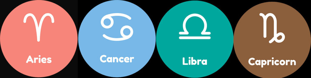 活動宮とは、スタート、エネルギッシュ、リーダシップの意味を持つ。牡羊座・蟹座・天秤座・山羊座の4つ。