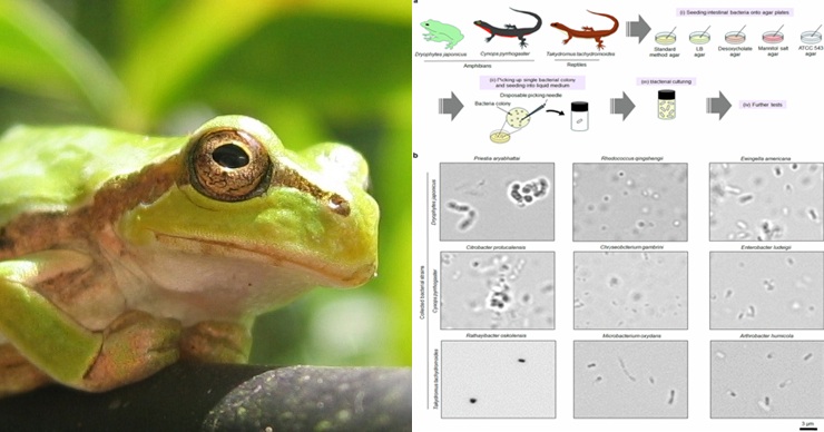 哺乳類に比べて、爬虫類や両生類は極めて強力な免疫システムを持っている。とりわけ両生類の免疫は頑丈で、ほとんど腫瘍ができない。彼らは非常にガンになりにくいのだ。そこで、ニホンアマガエルとニホンイモリ、ニホンオオトカゲの腸内細菌45株を分離し、抗がん作用を引き出す菌を特定した。それが、二ホンアマガエルの腸内細菌のひとつ「Ewingella americana」だ。