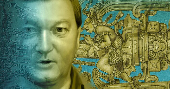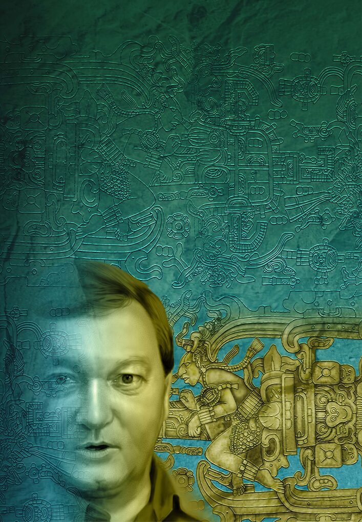 今月の表紙はデニケンの説の中でも有名な「パレンケの石棺」で、メキシコの古代マヤ遺跡「碑銘の神殿」の地下墓室で1952年に発見された、7世紀の王パカル王の墓のレリーフをモチーフに描いてみました。巨大な一枚岩の蓋に描かれた模様が宇宙飛行士のように見えると言われています。そして、そこにデニケン本人のポートレートを重ねてみました。