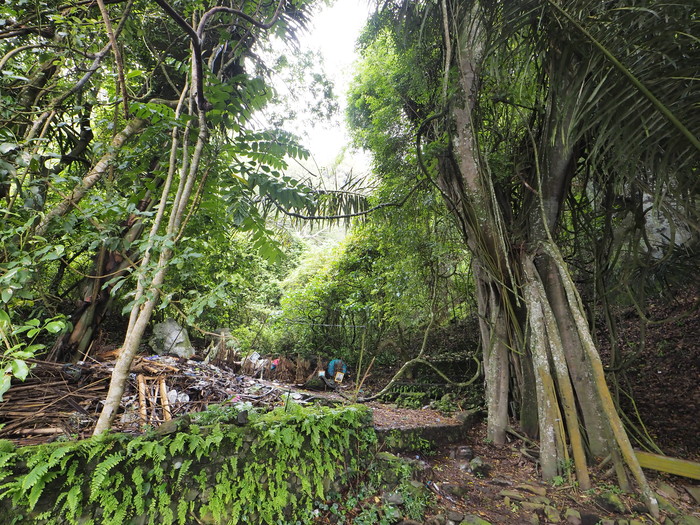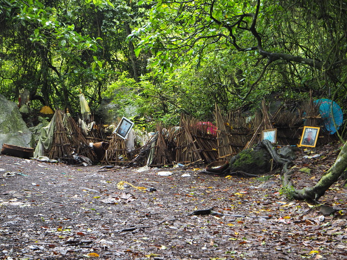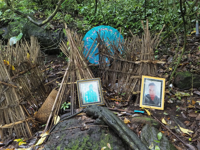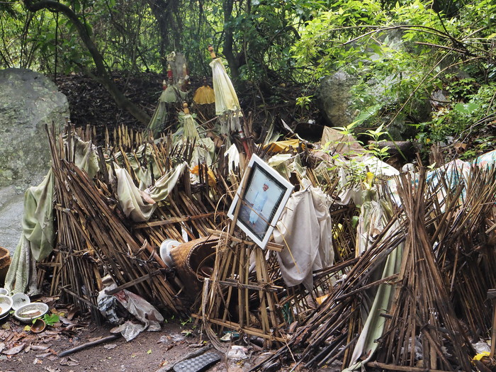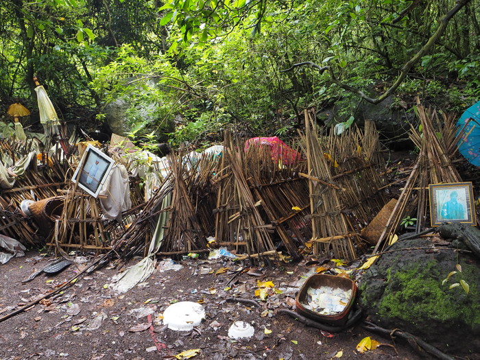 墓には故人の写真や縁の品だろうか、傘や布が供えられている。湿気が多いのもあるが、なんだかごちゃごちゃした印象だ。