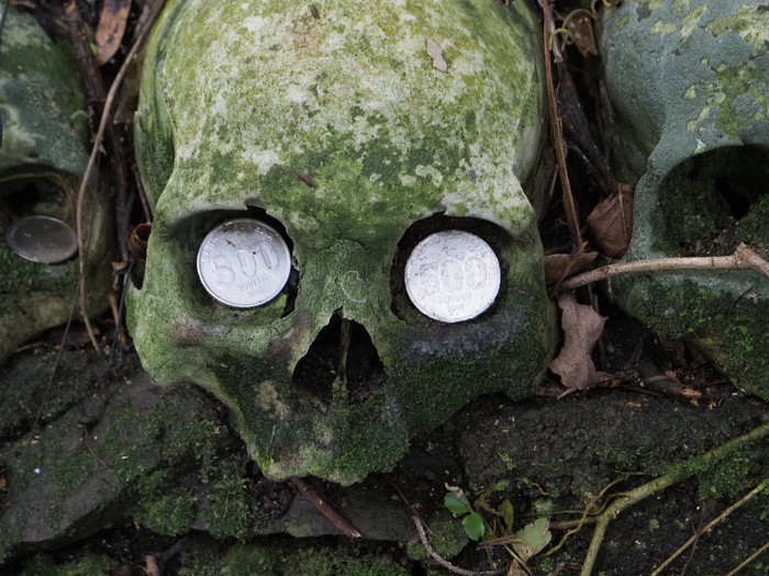 並んだ頭蓋骨の中でやけに目がキラリと光っていると思ったら、両目に500ルピー(約4円)のコインが嵌められていた。