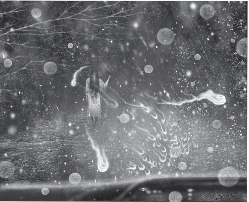峠の中腹まで来たときのこと、トラックの前方に人影を認めました。 父のトラックが近づくと、白いワンピース姿の若い女性が、濡れながら手を上げています。まるで乗せてほしいとでもいっているようでした。