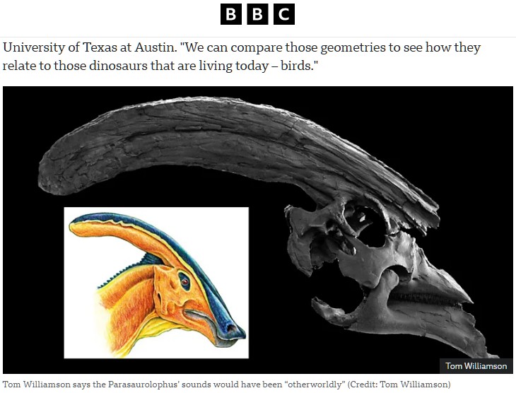 なお、化石に軟骨部分は保存されないため、パラサウロロフスが一般的な発音器官を持っていたかどうか不明なのだが、研究チームによれば、もしも声帯などの発音器官がなかったとしてもこのトサカで音を発することができたはずだという。そして、研究チームはトサカに空気が通った際に発生する音も再現した。