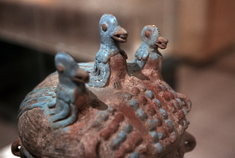 マヤではケツァールは「神の鳥」として、さまざまな意匠に用いられている。写真は蓋にケツァールが施された容器で、生命の甦りの願いを表している。