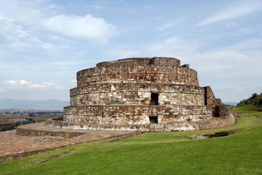 メキシコのカリストラワカにある円形ピラミッド。とぐろを巻いたヘビのような構造は、ケツァルコアトルを表すという。