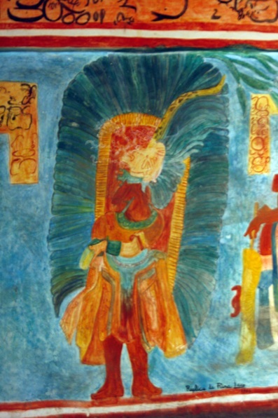 ボナンパック遺跡の壁画に描かれた王族。オスのケツァールの尾羽で作った冠をかぶっている。美しい緑の羽根はマヤでは装飾品として珍重され、ケツァールを殺すことは禁じられていた。