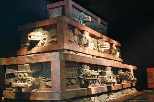 メキシコシティの国立人類学博物館に展示されている、テオティワカンの「ケツァルコアトルの神殿」の復元建造物。牙を持ち、とがった顔のまわりに羽毛をたたえているのがケツァルコアトル神、中央に2つの目を持つ四角い顔がトラロック神だ。