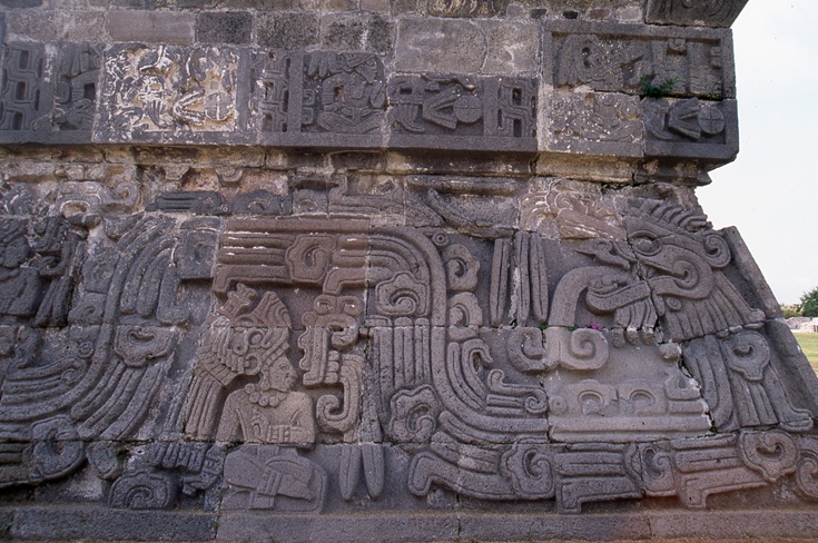 7~11世紀ごろ、メキシコ中部に栄えたショチカルコ遺跡にある「羽毛のヘビの神殿」。基壇部分には、ケツァルコアトルの見事なレリーフが残されている。