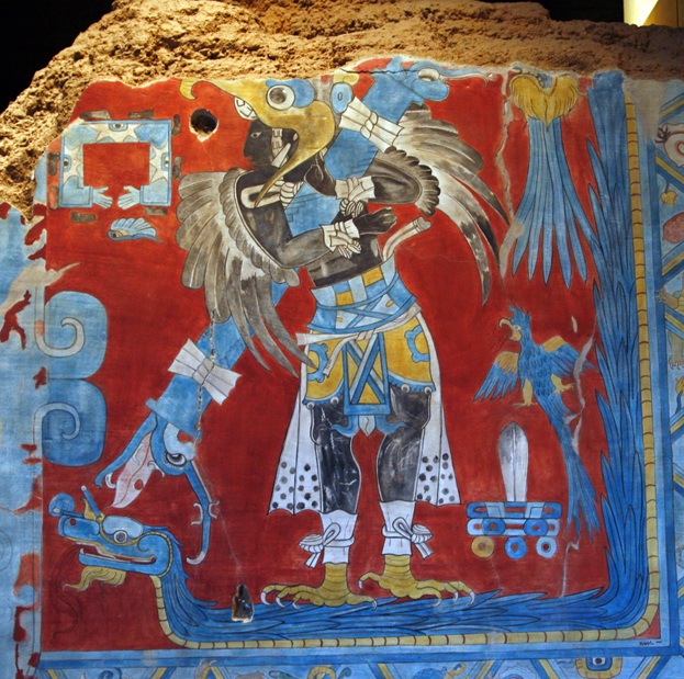 ケツァルコアトル神はさまざまな姿で表されている。これはワシの足を持つ戦士が「羽毛のあるヘビ」(ケツァルコアトル)の上に乗っている様子を表した、カカシュトラ遺跡の壁画。