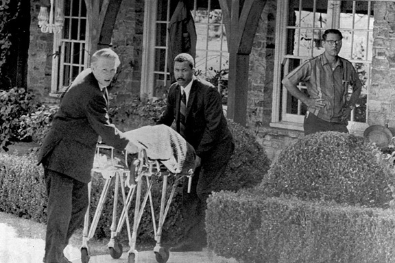 現場から遺体が搬出される様子。凄惨な事件の様子は世界中を震撼させた。(写真=Los Angeles Timesの記事”Manson follower’s tapes may yield new clues, LAPD says”より)