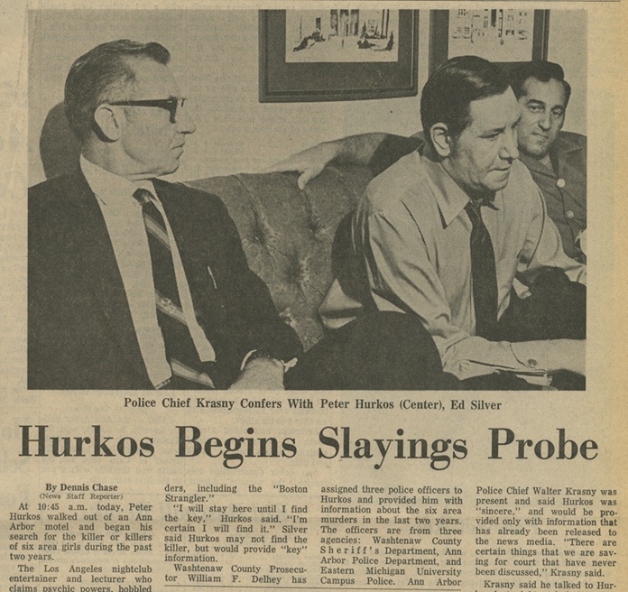 1969年7月に発生した女子学生殺人事件について、ミシガン州アナーバー市の警察署長とフルコスが協議したことを報じた地元紙の記事。フルコスは同年までに27件の殺人事件を解決に導いたと主張している。(写真=The Ann Arbor News/アナーバー地区図書館より)