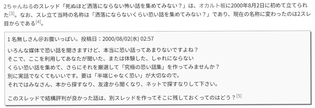2001年7月7日、2ちゃんねるオカルト板に立てられた「死ぬ程洒落にならない怖い話を集めてみない?6」スレッドにある話が書き込まれた。