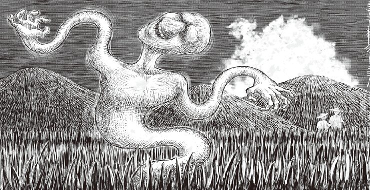それによれば、報告者がお盆に秋田県の祖母の家に帰省した際、兄と田んぼで遊んでいると、突然風がやみ、続いて気持ち悪いぐらいの生ぬるい風が吹いてきた。そのとき、報告者は兄が遠くにいる案山子をじっと見ていることに気づいたため、理由をたずねると、兄は「いや、その向こうだ」という。そこで案山子のさらに奥を見ると、田んぼの向こうに人ぐらいの大きさの白い何かがくねくねと動いているのが見えた。