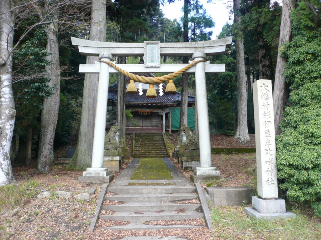 神々が馬を寄せた「駒寄(こませ)」、神々が休んだ「神和住(かみわずみ)」、神託の歌が聞こえた「歌波」、千反の布のうち一級品を献上した「一布地(いちぬのち)」、毒矢の毒を採取した「千徳(せんとく、もとは「千毒」だったという)」、猿鬼の目に矢が命中した「当目」、黒い血が流れた「黒川」、それが五十里も流れた「五十里(いかり)」、猿鬼が治療のためオオバコを摘んだ「大箱」等々、猿鬼伝説は地名由来ともなっている。「仁行」も大杉の二の枝の下にあったためと伝わる。
