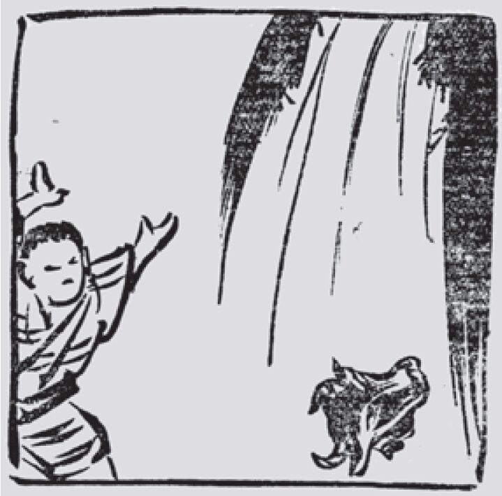 コーライ岩に着いた彼らは、淵に首を落とし、血を岩一面に塗りつけた。その間、K家次男は巻物を紐解き、読経をあげつづける。一行が帰るころには風が吹き出し、豆粒ほどの雨が降り注ぎだした。その勢いは凄まじく、若衆が着ていた浴衣の藍が抜け落ち、次男と同じ白衣になってしまうほどだった。