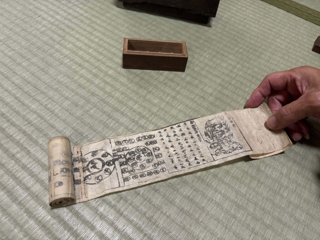 となると巻物の正体は「九重守経」で間違いないだろう。密教や修験道における小型の守護経であり、明王像や真言、曼荼羅などが書き記されている。南北朝末期から諸国行脚の修験者などが守り本尊として携帯し、江戸期からは大衆にも普及した。