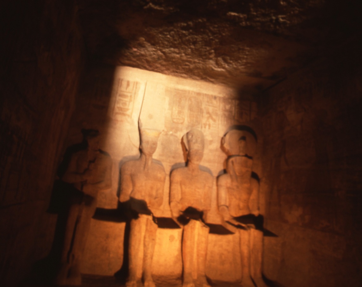 至聖所と呼ばれる部屋のつきあたりの壁に並ぶ4の像。右側から太陽神ラー・ホルアクティ、神格化されたラムセス2世、王の守護神アメン・ラー、そしてメンフィスの創造の神にして冥界神プタハが、差し込む朝日に照らされ、窓のない至聖所の暗闇に浮かびあがっている。