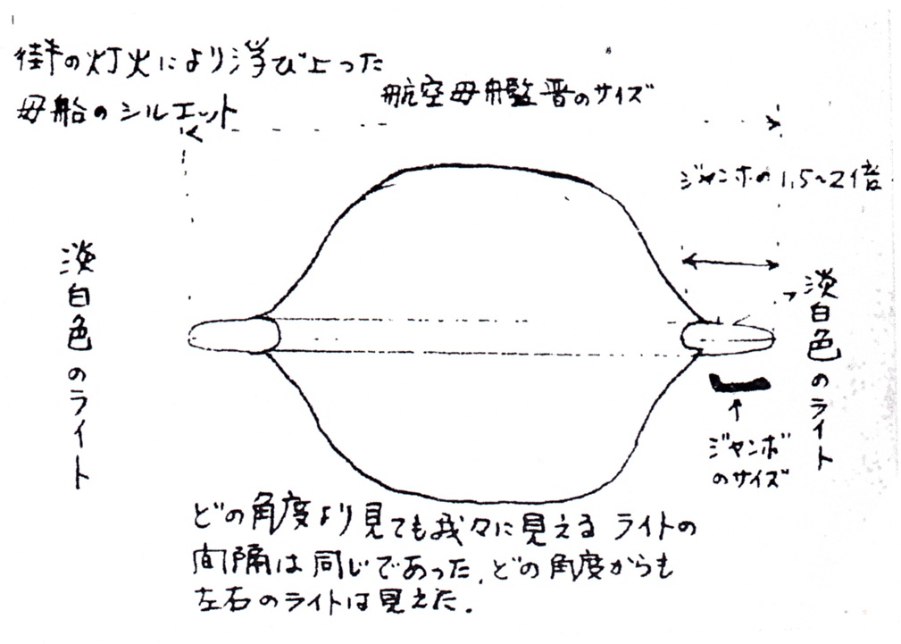 2隻の航空母艦を重ね合わせたような形状をしており、全体的には土星に似ていた。大きさはジャンボ機の数十倍。寺内機長は、最初に視認した2個のUFOの母船と見なし、航空母艦にたとえた。