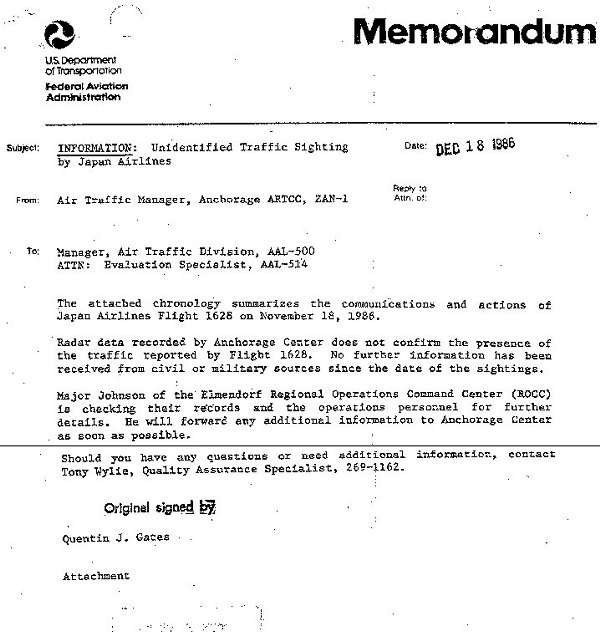 このUFO目撃事件は航空機の安全運航に影響があると見なされ、アンカレッジ空港着陸後、寺内機長はアメリカ連邦航空局(FAA)による事情聴取を受けたが、アルコールや薬物の影響下になかったことが確認されているにもかかわらず、である。