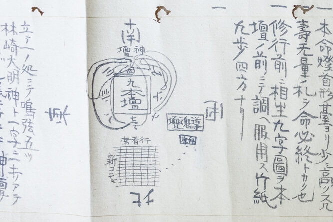 こうして祈呪壇を整えた後、いよいよ儀式が開始された。まず9本の直線を格子状にした「九字図」を奉げる。臨兵闘者皆陣列在前の九字を表し、ドーマンとも呼ばれる印だ。
