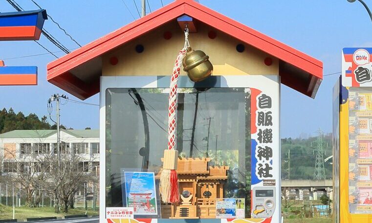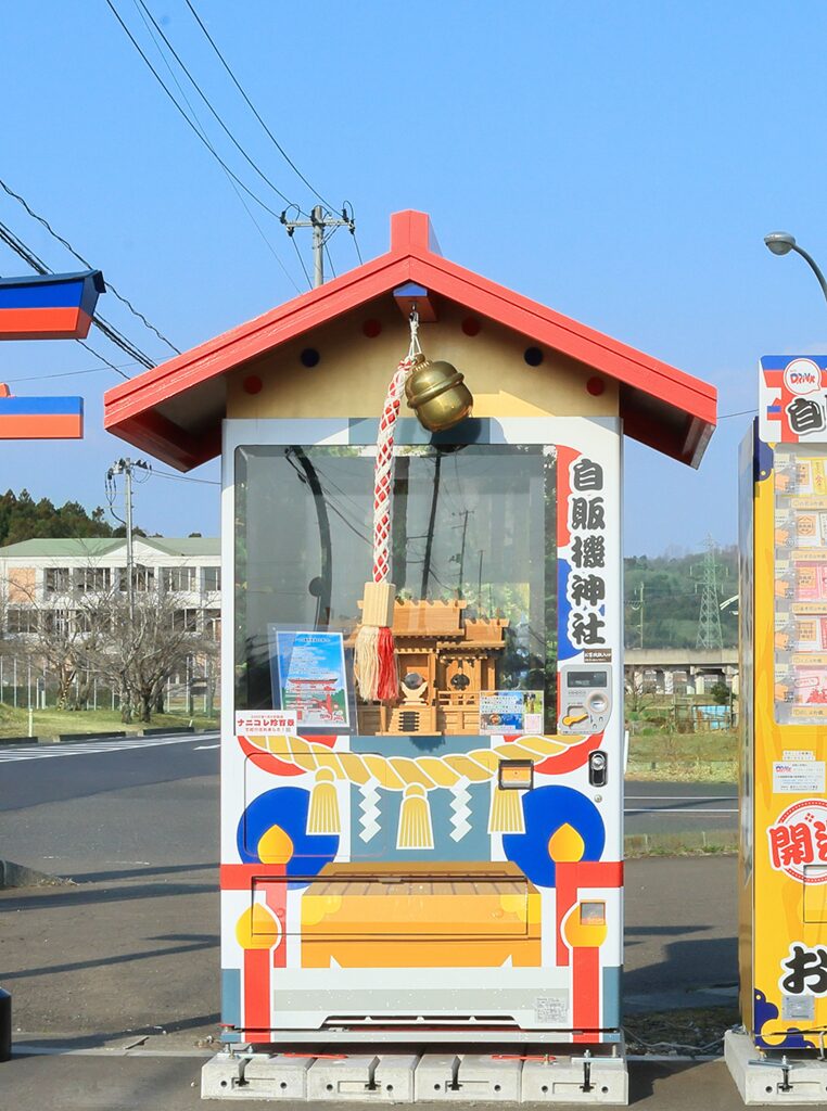 2024年5月某日に筆者は宮城県の名取駅にいた。タクシーに乗ってあるSNSで知った神社に向かったのだ。降りた場所にはズラッと自販機が並んでいる。そこには鳥居があり交通安全とともに自販機神社と書かれていた。正式名称を自販機神社with DRINK自販機ショップ名取愛島と言う。ドリンクが並ぶ自販機の中におみくじや御守りの自販機もあった。