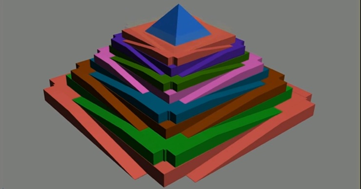 チェ氏は、ピラミッドはもともと「過剰に建造された」と考えている。まず最初に、運んできた石灰岩を積み上げ、緩やかなスロープ構造をもつ超巨大な台形の山が築かれた。そして次に頂上を決め、上の方から順に、角度を正確に測定しながら四角錐のシルエットを削り出していったというのだ。この方が正確な四角錐を形成しやすく、逆に言えば積み上げていく方法であの大きさの正確な四角錐を形成するのは至難の業であるという。