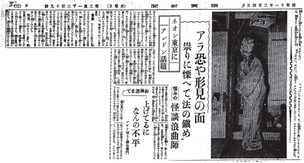 「怪談浪曲」の祖として、海老蔵は華々しい経歴を辿っていた。明治末年には、当時の芸人としては異例のアメリカ興行を敢行。天皇崩御やギャラ横領などの困難に遭いながらも、サンフランシスコやハワイでの巡業を成功させる。帰国後も、面や衣装に凝った演劇的な怪談が喝采を得ていたものだ。