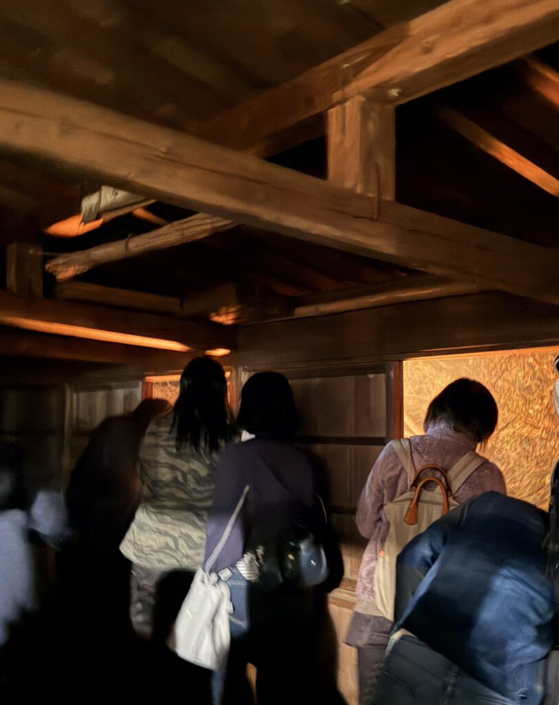 どうやらこれから鬼たちは講堂の柱の外、外周の廊下を巡るらしい。今までは舞台だった内陣に人々を移動させるために、カイシャクが荒っぽく叫びながら、松明を振り回して交通整理をする。鬼も怖いがカイシャクも怖い……でもちょっとカッコいい。
