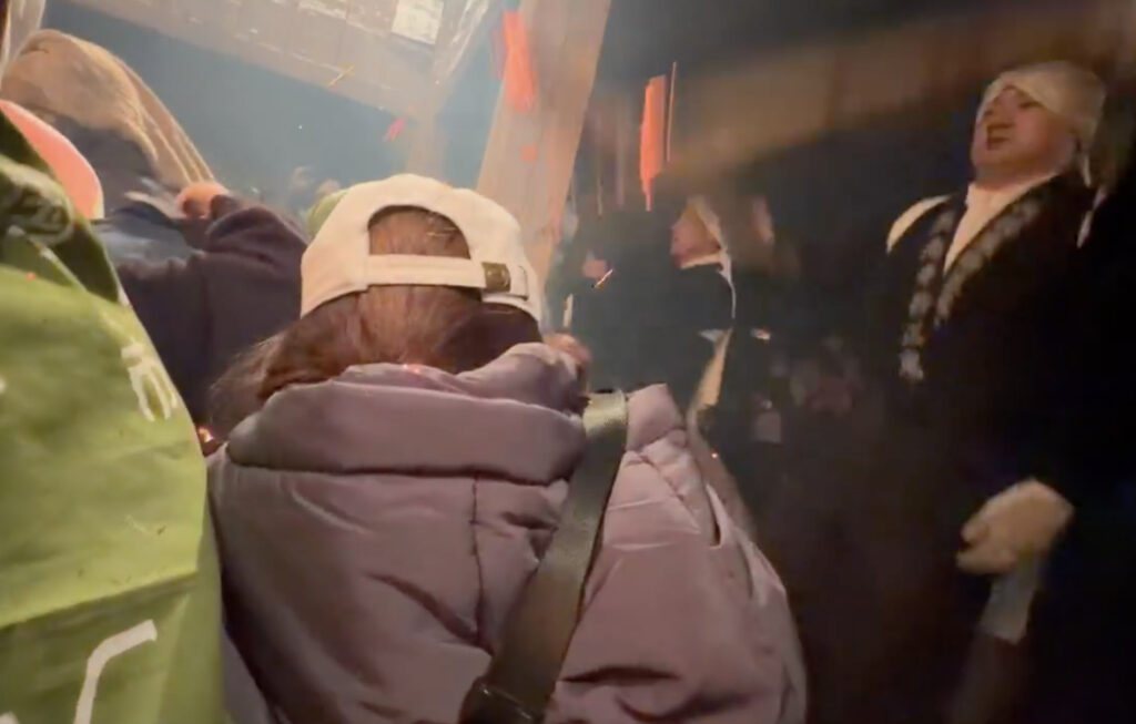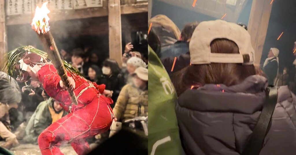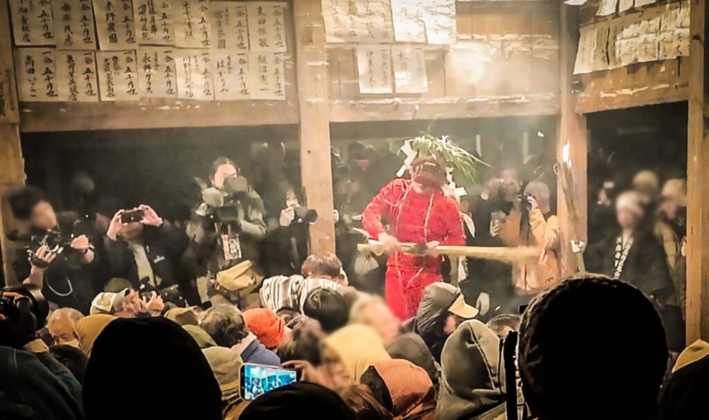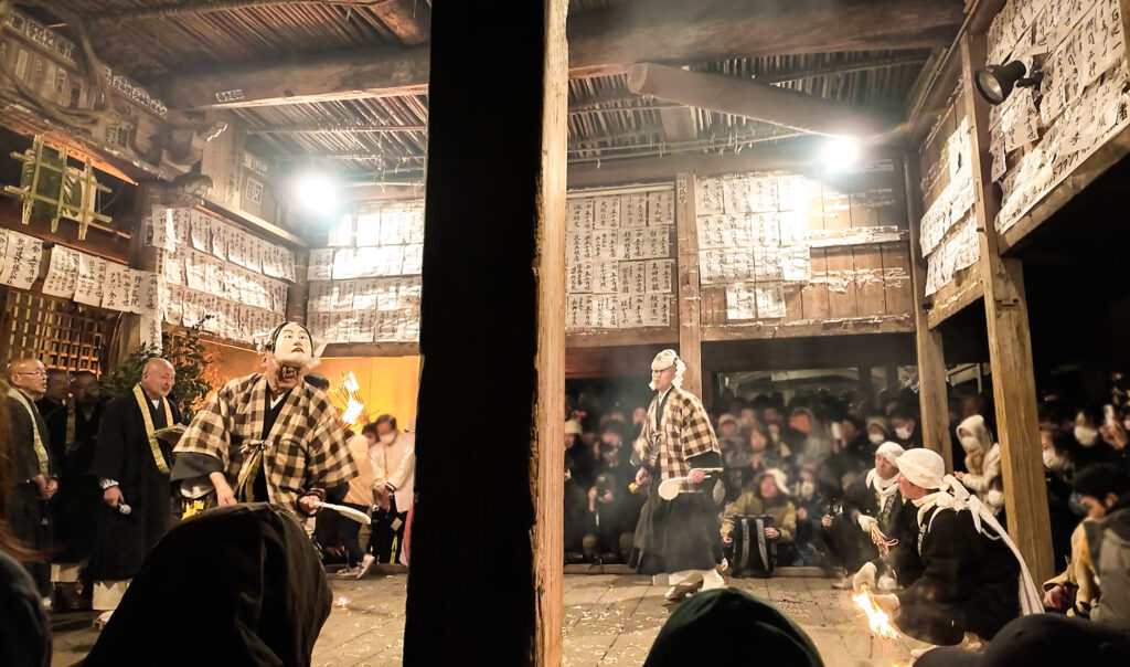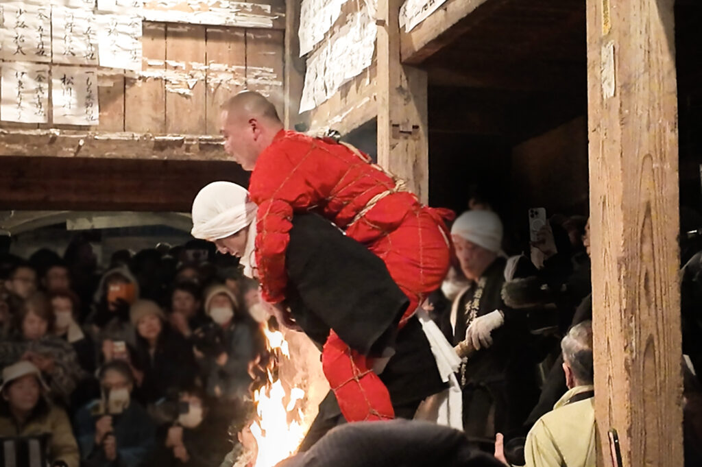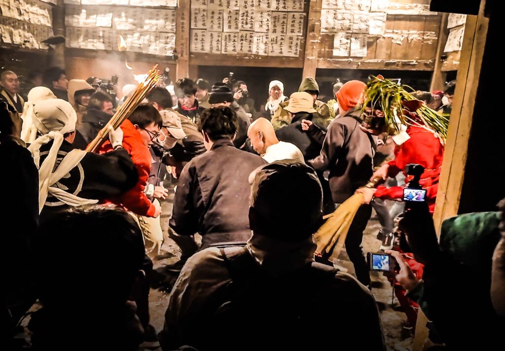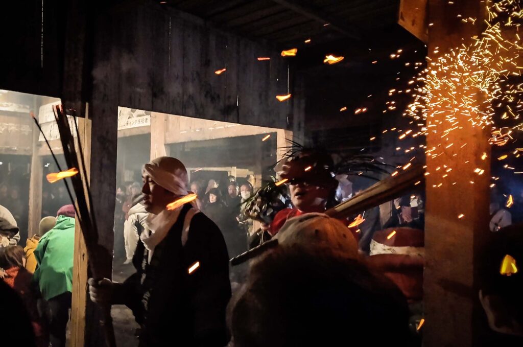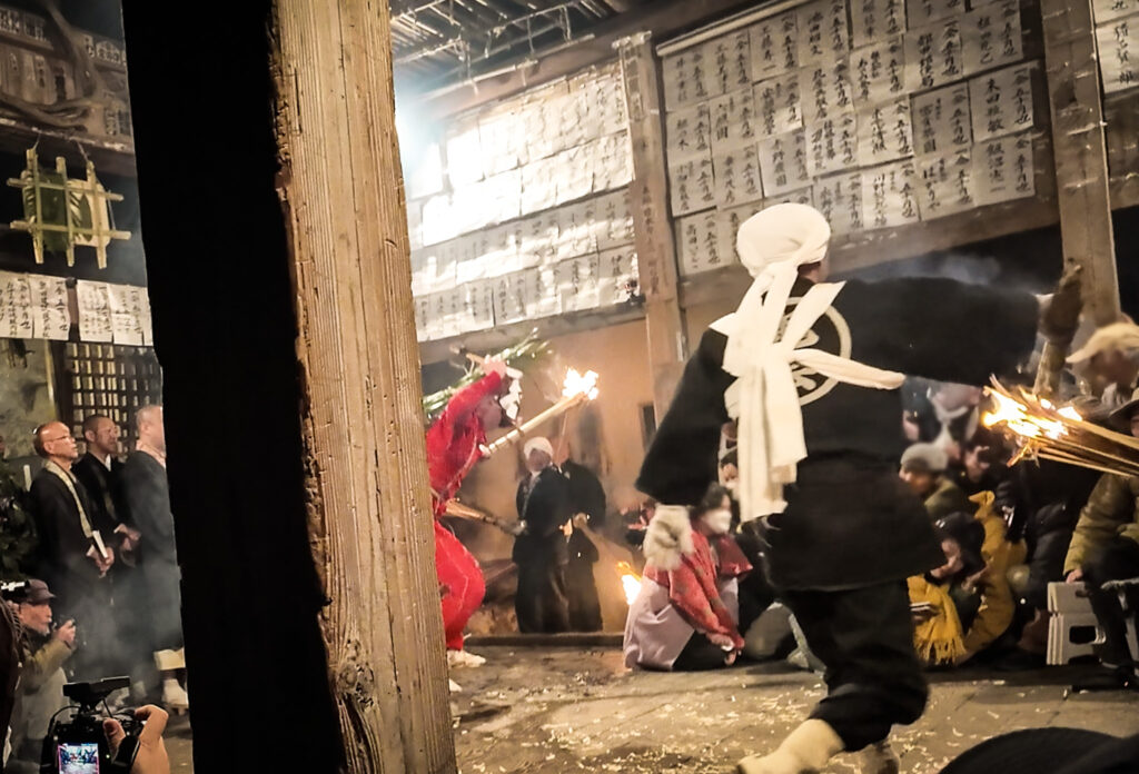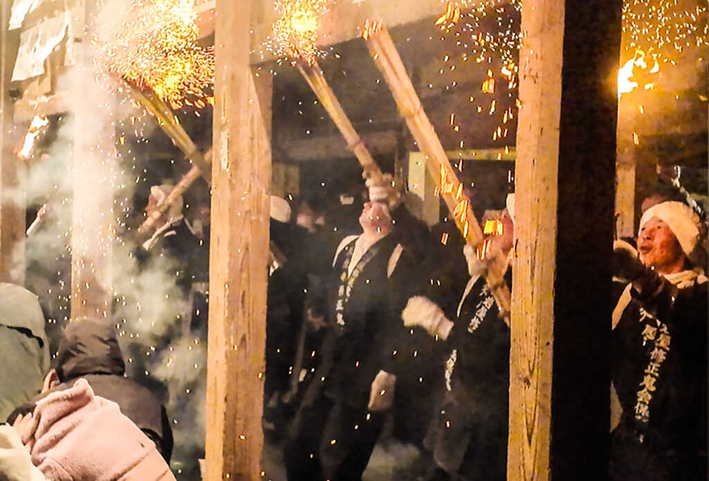 という掛け声と共に、堂内の鴨居部分に松明が激しく打ち付けられる。その度に盛大に火花が舞い、真下にいる人々から「アッツ!」「きゃあああ」と悲鳴が上がる。
