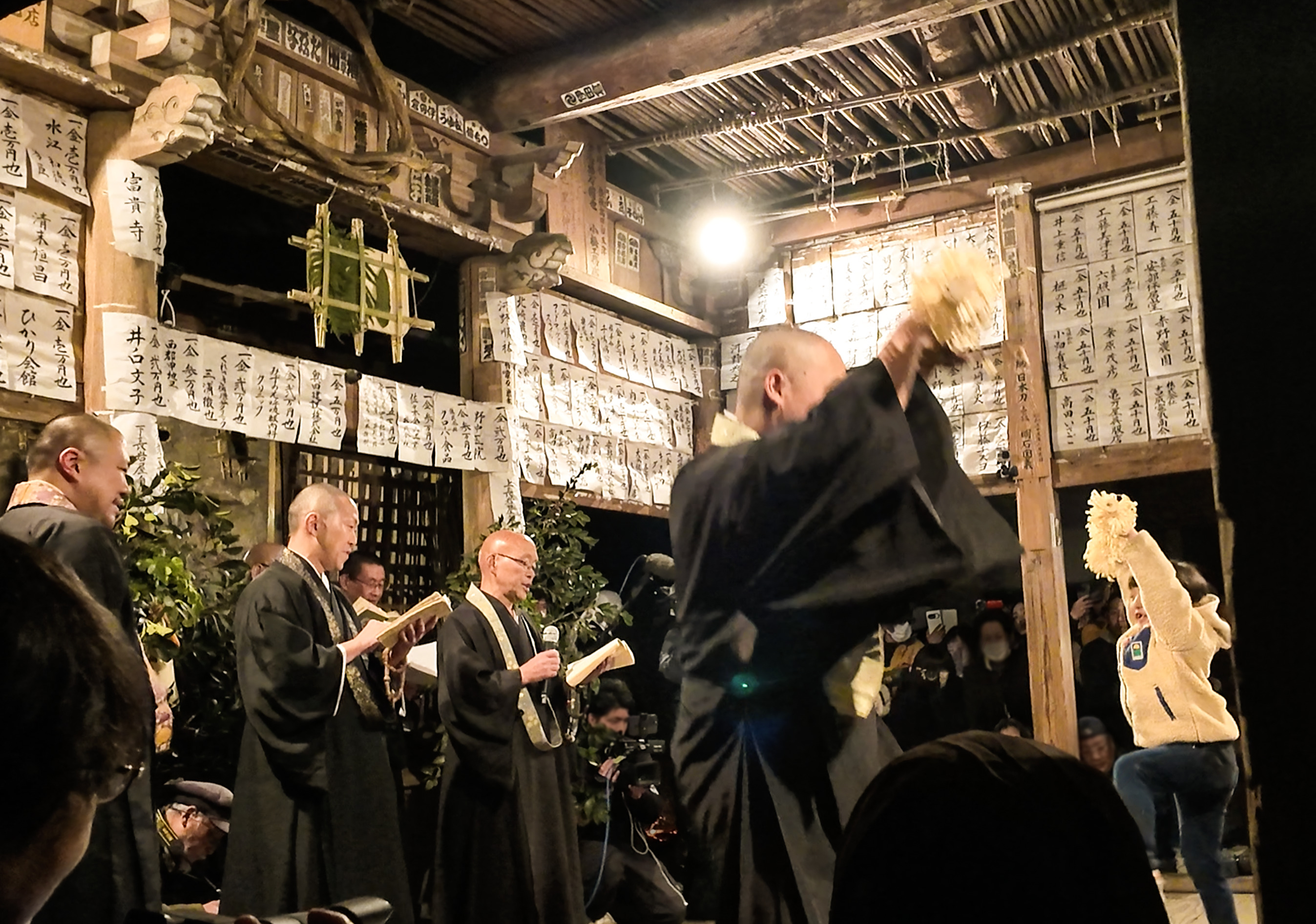 「垢離取り」が終わると、舞台は川から講堂と身灌神社へ。講堂の天井付近には、一番下の列が所々剥がれているものの、檀家の名が書かれた紙が所狭しと貼られている。