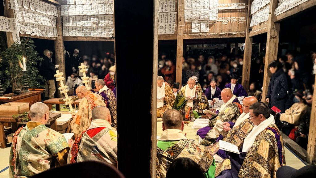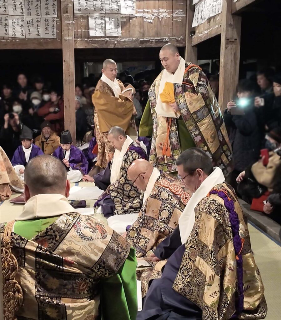 祭りの熱気が盛り上がる中、煌びやかな法衣に身を包んだ僧侶たちが現れ、夜の勤行が始まる。