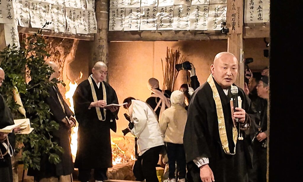 名MCに聞き入っていると、いつの間にか僧侶の背後で炎が燃え上がっていた。ここからはよく見えないが、講堂の隅が石に囲まれた火起こし場になっているらしい。あまりに自然に火をつけるので一瞬受け入れかけたが、ここは木造の堂内である。火事にならないのだろうか。