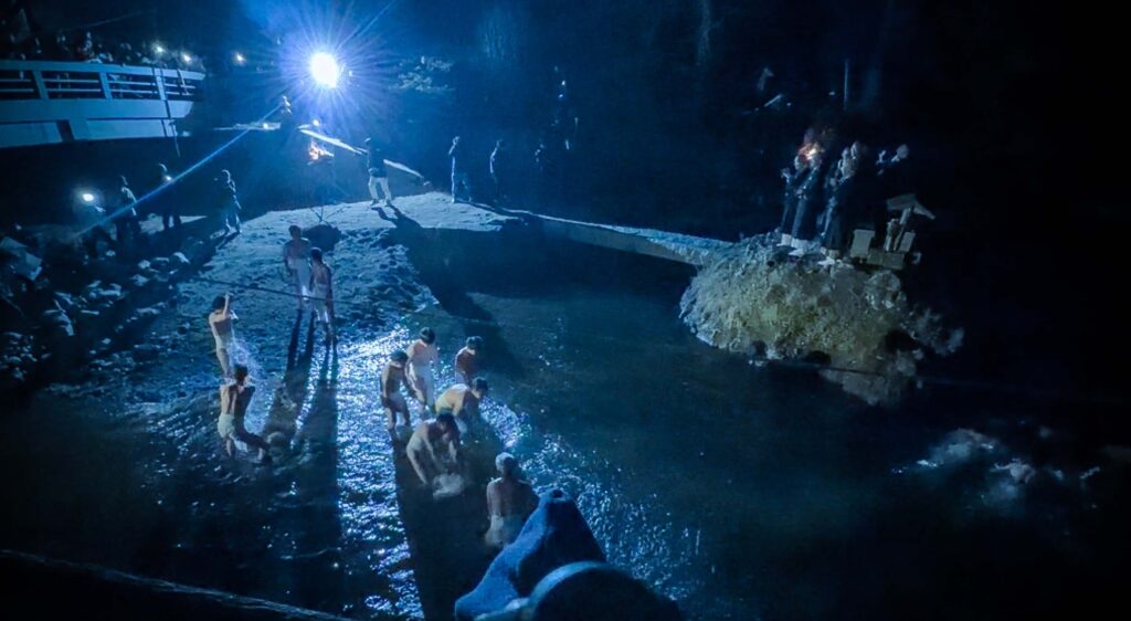 僧侶たちが川中不動の前で読経する中、鬼に扮する僧侶と、介添えを務めるテイレシ・カイシャクたちが、極寒の清流にふんどし姿で入っていく。「あー! さみぃ!!」という男たちの素直な悲鳴に思わず笑ってしまう。