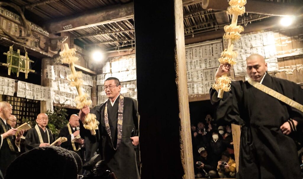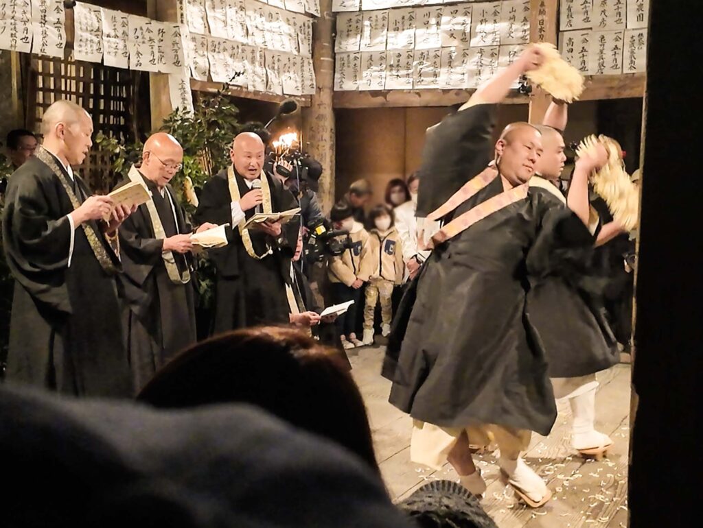 「地結、金剛結、四方結、金剛結」と唱えて刀で結界を張り、鬼の堂外の脱出や魔の侵入を防ぐ儀式だ。これが完了すると、ついに鬼たちが姿を現す。