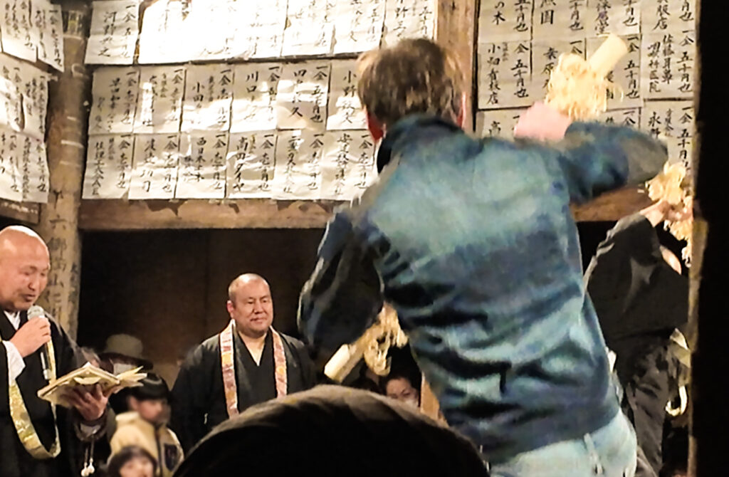 そして最後は、鬼たちが松明で参詣者の背中を叩き、無病息災を祈願する。ここはせっかくなので私も体験してみたが、やはり叩きっぷりに容赦がない。