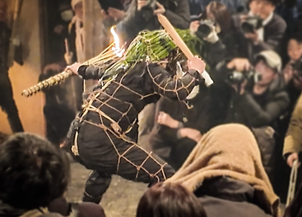 鬼たちの荒々しい掛け声に人々の阿鼻叫喚が重なる。激しく叩きつけられる松明から火の粉が弾け飛び、参詣者たちは雪崩を打って逃げ惑う。
