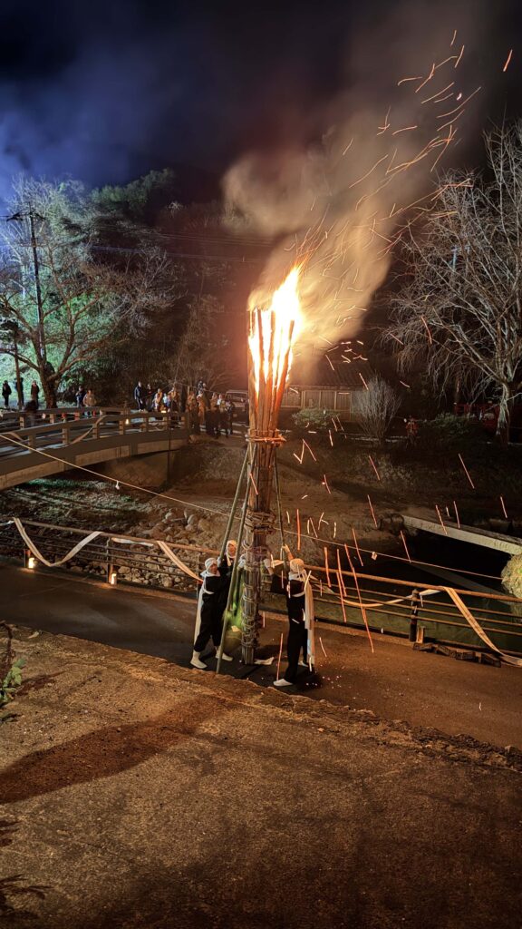 長さ6メートルをゆうに超える大松明が立ち上がった様は圧巻。