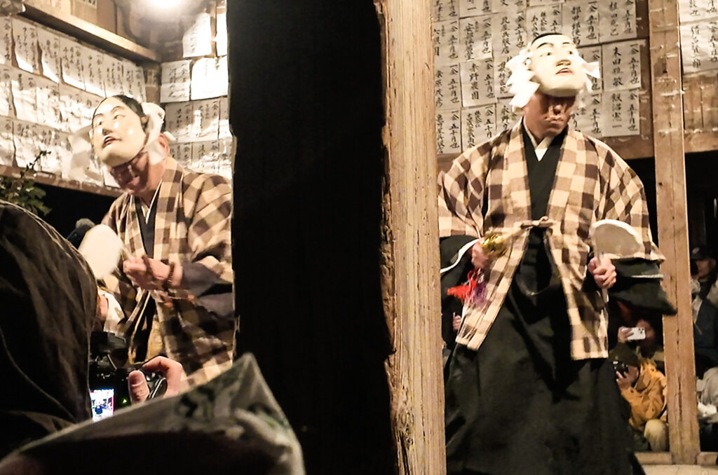 ちなみに、面の下から覗くのは、「オニヤッシャ」と呼ばれる植物だ。一般にはリュウノヒゲとして知られ、豊かに実る稲を象徴しているという。