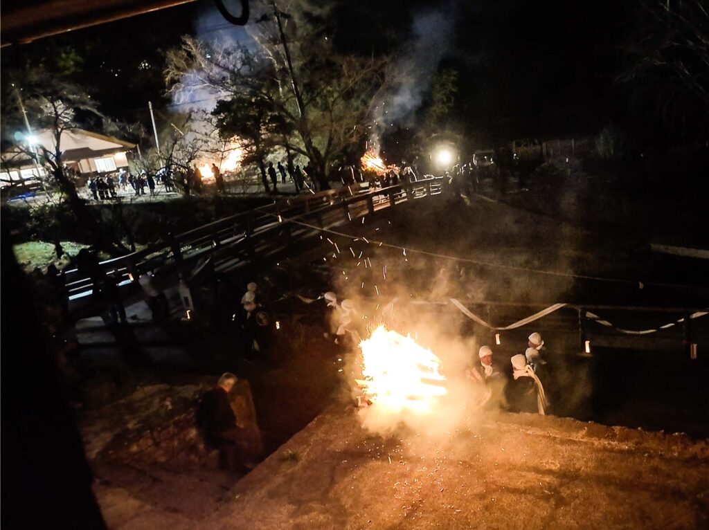 あまりに非日常すぎる体験に呆然とする中、2体の鬼が松明を合わせる「火合わせ」が行われ、「鬼の目餅撒き」に突入する。