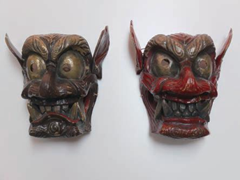 ここで彼らが被る鬼の面は、角がなく顔に筋があるのが特徴。天念寺を始めとする西国東の鬼面はこのタイプが多いという。大きな耳は、民衆の願いを聞き届けるためとも言われる。
