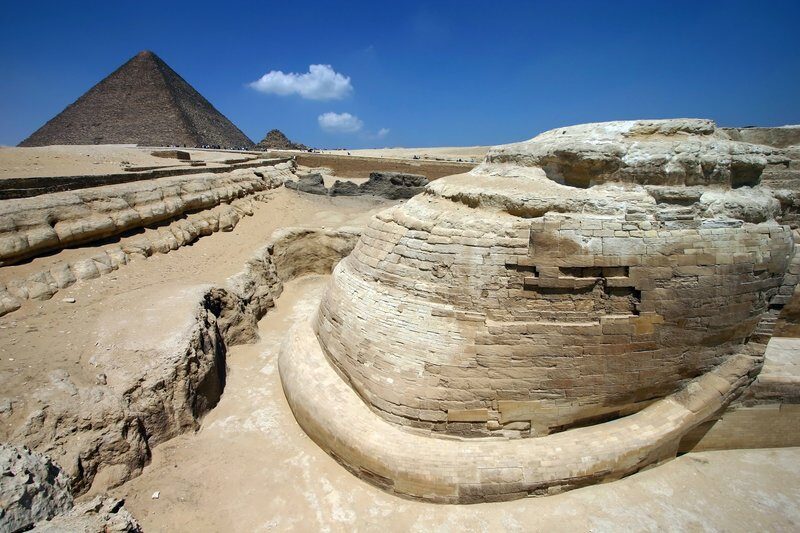 大スフィンクスの側面やお尻の部分、さらに背中などにはいくつも縦穴が残っている。ただしこれは、紀元前500年ごろ、古代エジプトが衰退した末期王朝時代に、大スフィンクスに隠されたという財宝を捜すために掘られたとされている。