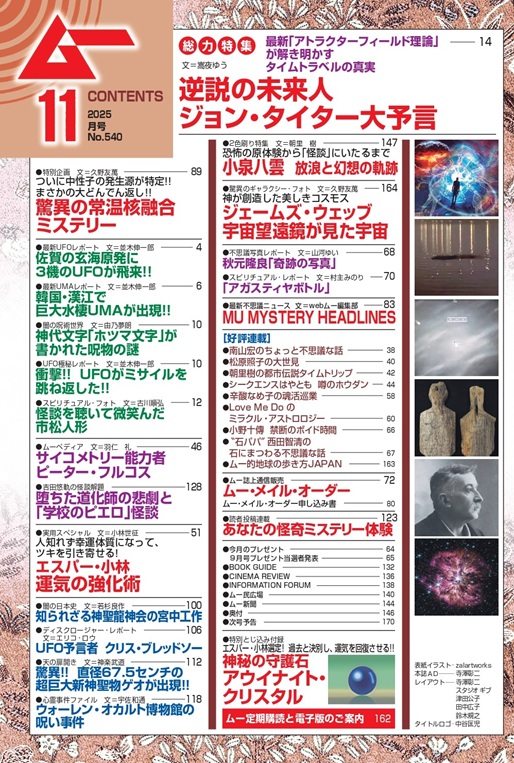 2色刷り特集 小泉八雲/実用スペシャル エスパー・小林 運気の強化術/別冊スペシャル付録 神秘の守護石ナウイナイト・クリスタル/佐賀の玄海原発に3機のUFOが飛来!!/ウォーレン・オカルト博物館の呪い事件/ジェームズ・ウェッブ宇宙天体望遠鏡が見た宇宙/韓国・漢江で巨大水棲UMAが出現!!/驚異!! UFOがミサイルを跳ね返した!!/神代文字「ホツマ文字」が描かれた呪物の謎/怪談を聴いて微笑んだ市松人形 ほか